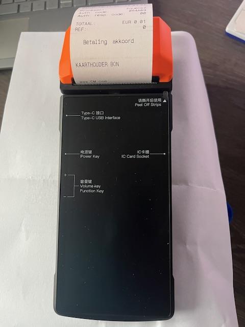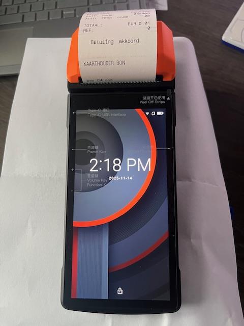 Voorlopig wordt het nieuwe pinapparaat middels een netsnoer verbonden met het stopcontact maar volgende week zal hiervoor een oplaadstation komen zoal nu bij het oude pinapparaat.